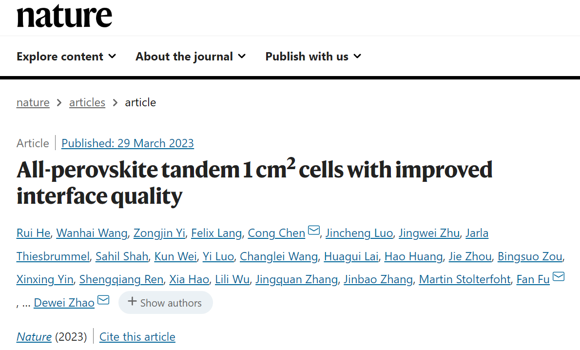 近日,我院光电材料与技术团队邹炳锁教授和黄浩博士与四川大学、厦门大学等单位合作研究成果以“All-perovskite tandem 1 cm2 cells with improved interface quality”为题发表于nature。