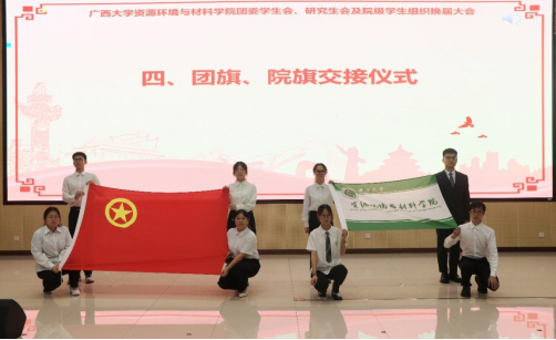 学院团委、学生会和研究生会新老成员代表交接共青团团旗和天天干夜夜操院旗,寓意着在团旗和院旗的见证下,承载着责任与使命的“青春接力棒”顺利交接。