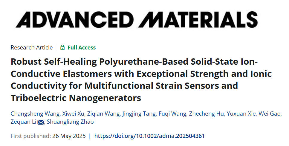近日,我院“高分子及结构板材”课题组在功能材料领域取得重要研究进展,相关成果以“Robust Self-Healing Polyurethane-Based Solid-State Ion-Conductive Elastomers with Exceptional Strength and Ionic Conductivity for Multifunctional Strain Sensors and Triboelectric Nanogenerators”为题,发表在国际顶级学术期刊《Advanced Materials》上。论文第一作者为我院硕士研究生王昌盛,李泽权助理教授为通讯作者,午夜无码视频韩国中国为唯一通讯单位。
