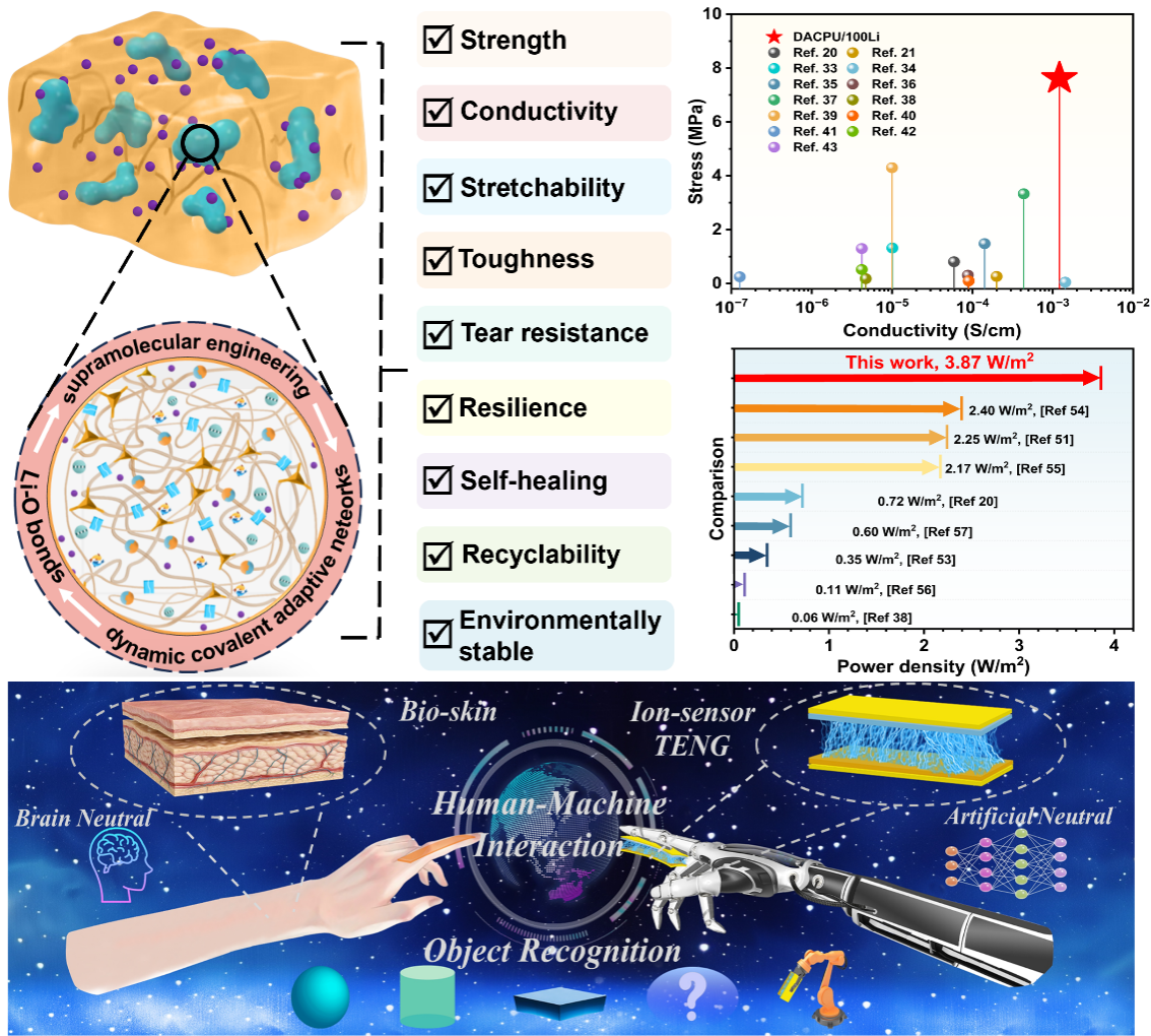 本研究通过结合超分子工程和动态共价自适应网络,成功合成了一种具有优异综合性能的自修复聚氨酯基固态离子导电弹性体 (DACPU/100Li)。DACPU/100Li 表现出超高离子电导率 (1.23 × 10-3 S cm-1) 和高拉伸强度 (7.62 MPa),断裂伸长率高达 1200%。此外,它还表现出优异的抗撕裂性能,断裂能为 45.6 kJ m-2,自愈效率为 96%(在 120°C 下自愈 24 h后),可回收性好,在极端条件下稳定。基于 DACPU/100Li 的传感器具有高灵敏度(5.89)和宽应变范围(0.1–1000%)。结合机器学习,它能够实现精确的手势识别和人机交互。此外,基于 DACPU/100Li 的摩擦纳米发电机可实现 3.87 W m-2 的高功率密度。它从身体运动中收集能量为小型设备供电,并通过机器学习帮助识别物体。人们相信,这些固态离子导电弹性体为可穿戴电子产品、能量收集和离子电子学提供了新的机遇。