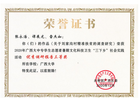 近日,据共青团广西壮族自治区委员会《关于2020年广西大中专学生志愿者暑期文化科技卫生“三下乡”社会实践活动的通报》,我院环工182班张永浩同学荣获2020年广西大中专学生志愿者暑期文化科技卫生“三下乡”社会实践活动优秀个人,环工182班张永浩、谭展龙、雷杰如同学的《关于刘家沟村精准扶贫的调查研究》报告荣获2020年广西大中专学生志愿者暑期文化科技卫生“三下乡”社会实践活动优秀调研报告三等奖。他们利用2020年暑期对山东省日照市刘家沟村当地的精准扶贫工作进行了深入调研,结合实际情况与学所知识,撰写出了高质量的调研报告,为当地扶贫工作出谋献策。