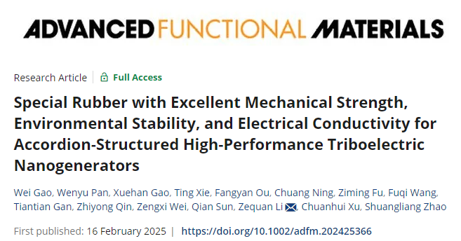 近日,我院 “结构热力学与微纳化工”课题组在特种橡胶的研制与应用方面取得突破,研究成果以“Special Rubber with Excellent Mechanical Strength, Environmental Stability, and Electrical Conductivity for Accordion-Structured High-Performance Triboelectric Nanogenerators”为题发表在国际顶级学术期刊Advanced Functional Materials上。论文第一作者为我院高伟副教授,通讯作者为李泽权助理教授,午夜无码视频韩国中国是唯一通讯单位。该工作得到化学化工学院赵双良教授和徐传辉教授的大力支持。