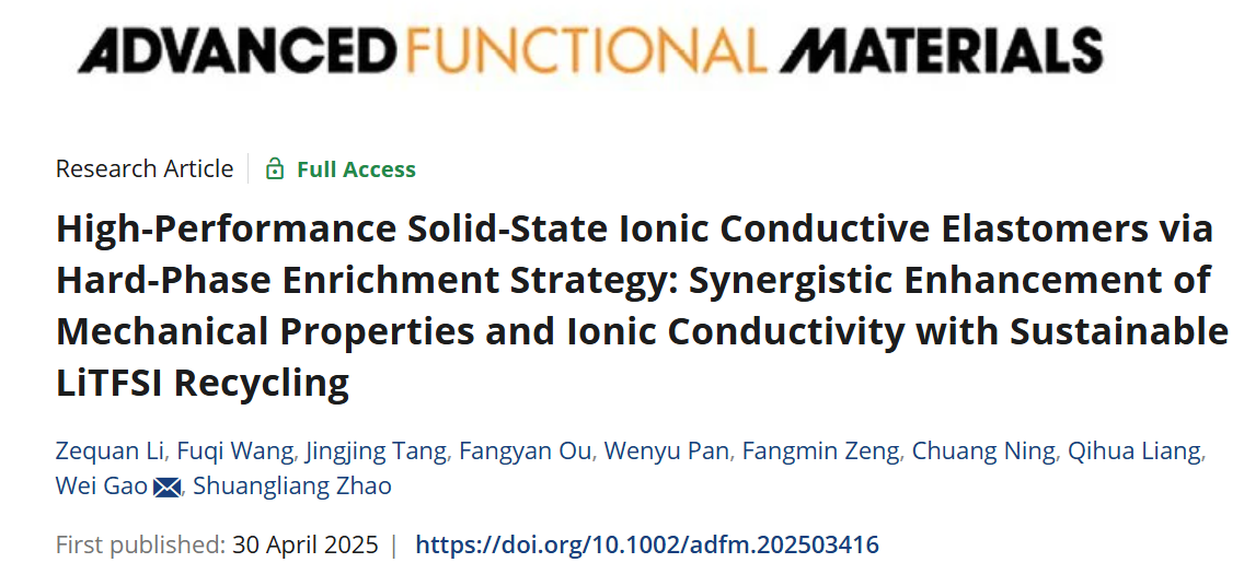 近日,我院“高分子及结构板材”团队在固态离子导电弹性体研究方面取得新进展,研究成果以High-Performance Solid-State Ionic Conductive Elastomers via Hard-Phase Enrichment Strategy: Synergistic Enhancement of Mechanical Properties and Ionic Conductivity with Sustainable LiTFSI Recycling为题,发表在国际知名期刊Advanced Functional Materials上。文章第一作者为助理教授李泽权,通讯作者为副教授高伟,午夜无码视频韩国中国是唯一通讯单位。